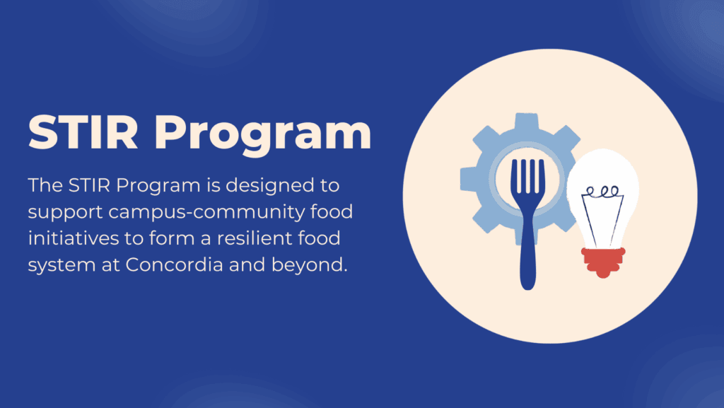 Through STIR, the Concordia Food Coalition supports student-led food groups at every stage of their journey—whether you’re planting the seeds of a new project, growing an existing initiative, or revitalizing your group’s impact. We help food initiatives grow their impact with tailored supports, training and access to expert advisors. Let’s stir things up together.